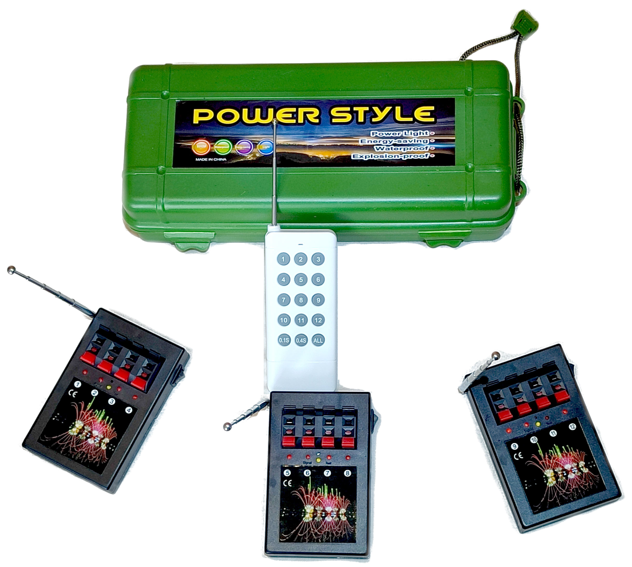 Handliche Funkzündanlage für Einsteiger mit 12 Kanälen, 3 einzelnene Empfängermodulen und Fernbedienung.